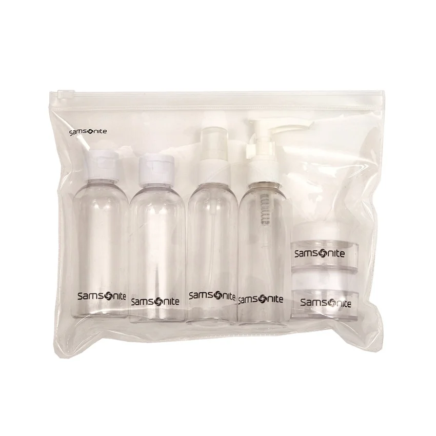 Este práctico juego de botellas de viaje incluye 4 botellas de plástico con tapas de presión, rociador, bomba y vertedor para empacar, guardadas en una bolsa con cremallera.