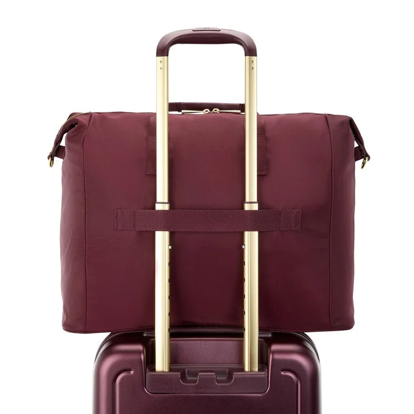la bolsa de viaje cuenta con una funda acolchada para computadora portátil, bolsillos interiores y frontales con cremallera y organizadores, una correa de hombro desmontable y una correa stackit™ para sujetarla fácilmente a su equipaje.