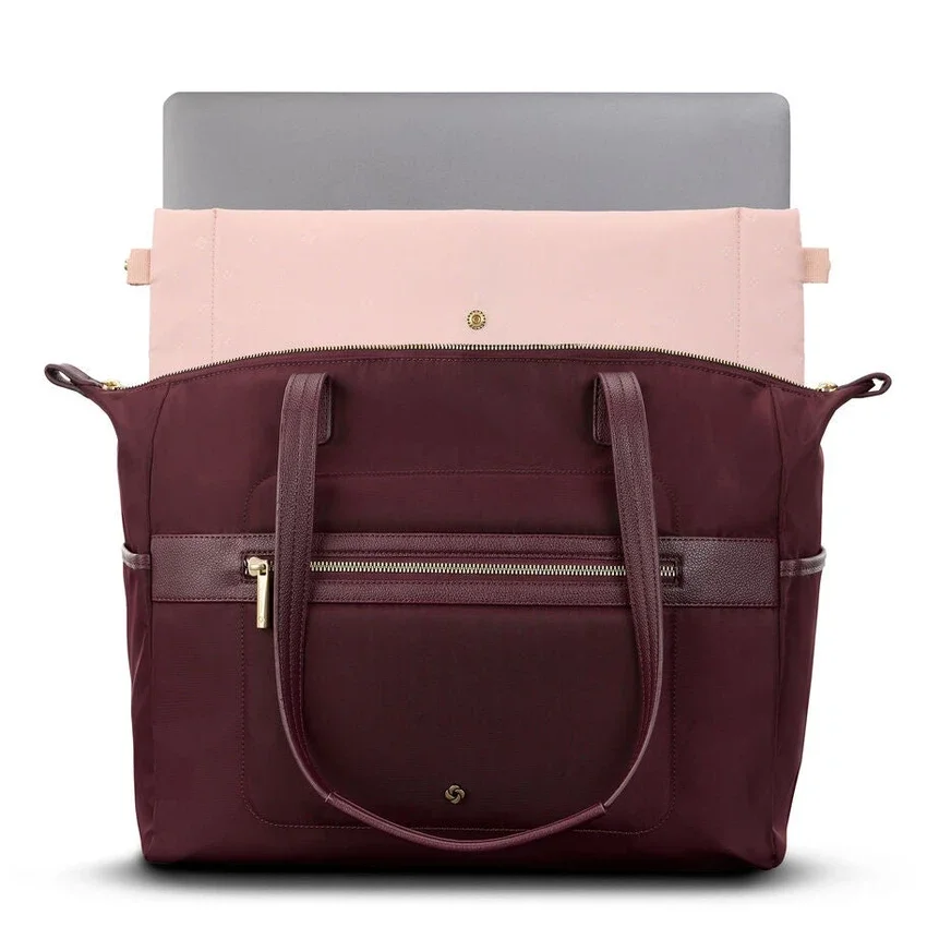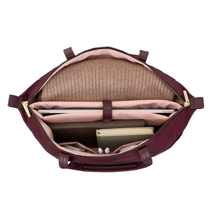 Este bolso tote combina un estilo sencillo y la practicidad con un interior espacioso, una funda acolchada extraíble para computadora portátil, compartimentos interiores, múltiples bolsillos exteriores y la discreta funcionalidad Stackit™