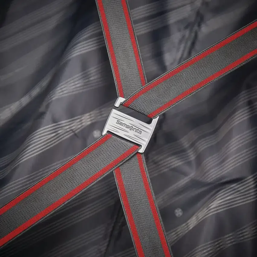 compartimentos de embalaje espaciosos con correas elásticas cruzadas diseñadas a medida con un toque de color a juego con el exterior y un panel divisorio con cremallera