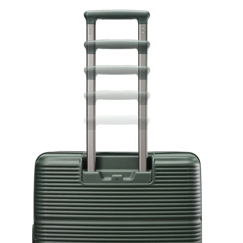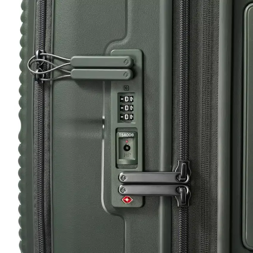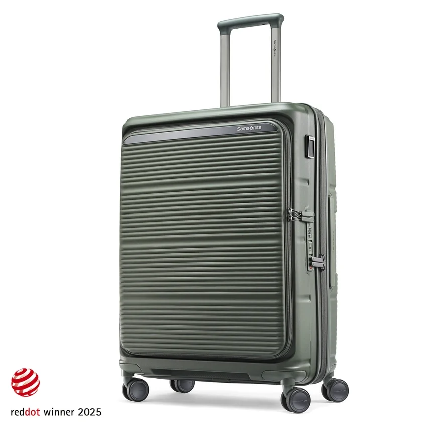 fabricada con materiales ultrarresistentes y sostenibles, la maleta spinner mediana se abre por el centro, como el equipaje tradicional, y cuenta con una segunda abertura frontal que le permite hacer y deshacer las maletas por completo cuando el espacio en el suelo es limitado.
