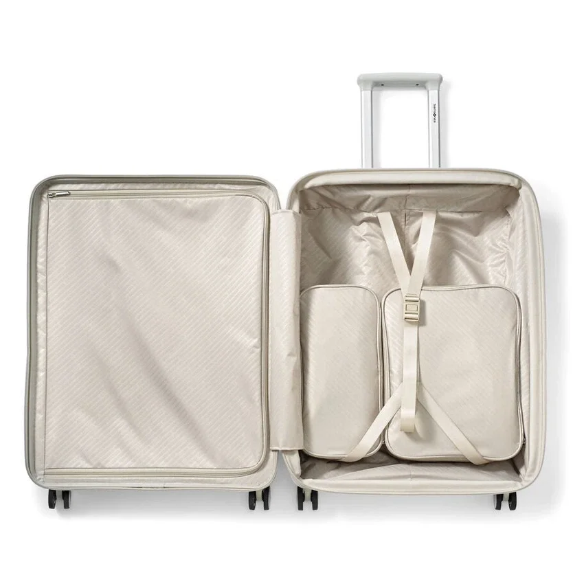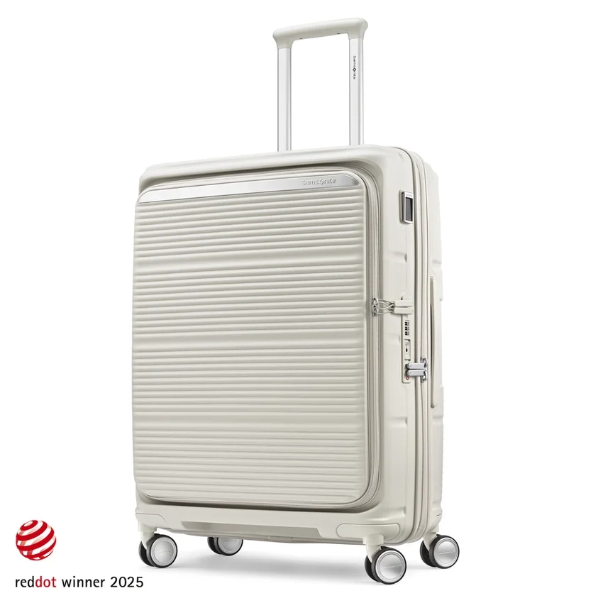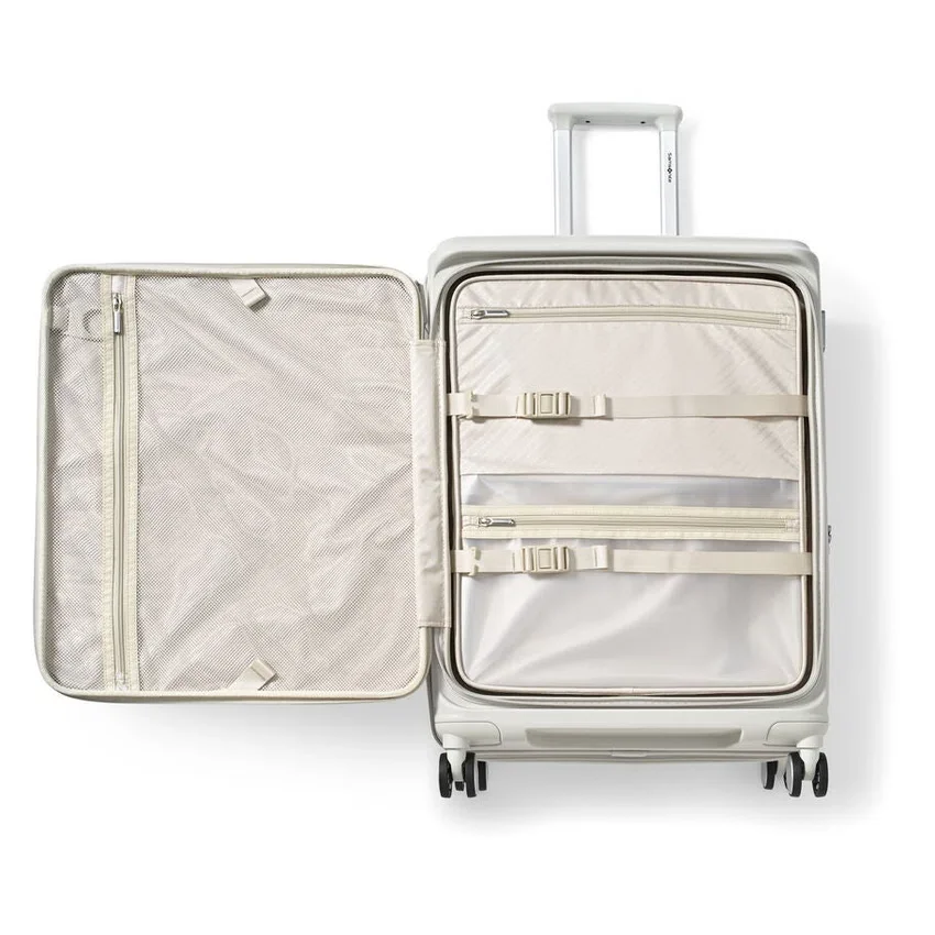 fabricada con materiales ultrarresistentes y sostenibles, la maleta spinner mediana se abre por el centro, como el equipaje tradicional, y cuenta con una segunda abertura frontal que le permite hacer y deshacer las maletas por completo cuando el espacio en el suelo es limitado.