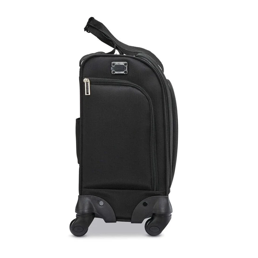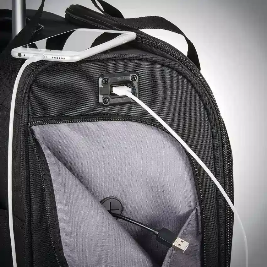esta maleta con ruedas y espacio debajo del asiento cuenta con la comodidad moderna de un puerto USB y la movilidad de las ruedas giratorias para desplazarse con facilidad por cualquier superficie.