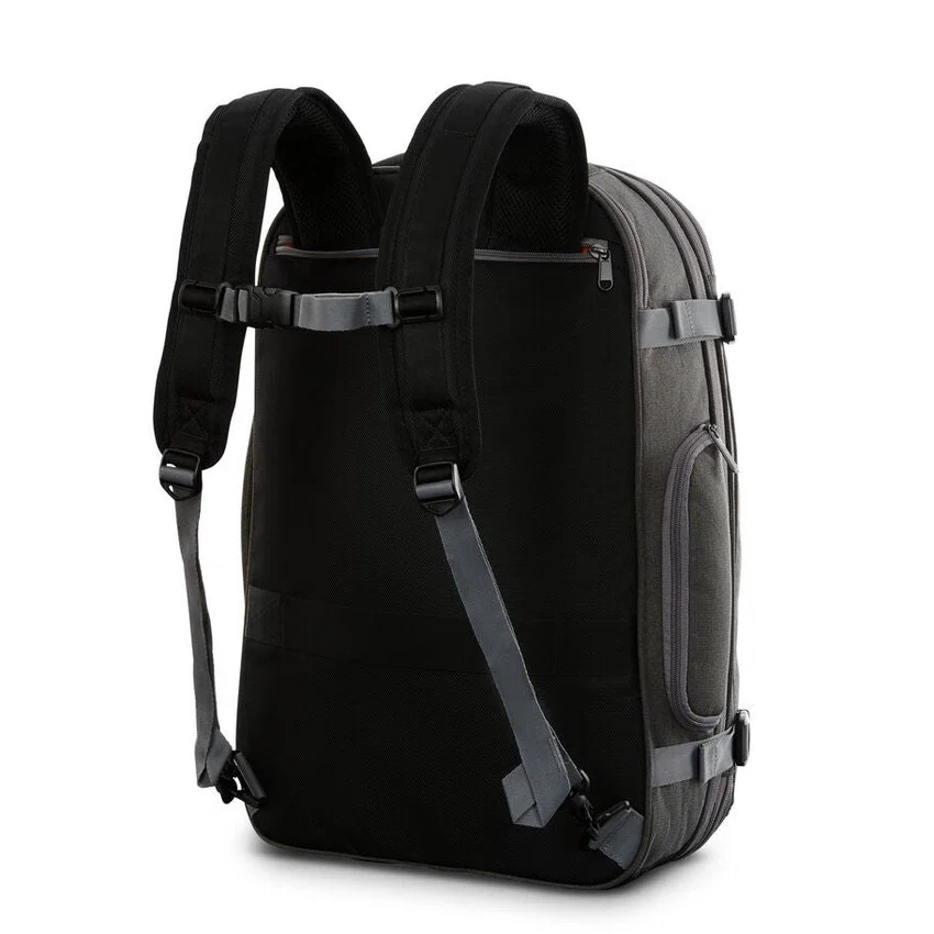 Esta mochila tiene un montón de bolsillos estratégicamente colocados por dentro y por fuera para que todo tenga su lugar. No solo es fácil de organizar, sino que es expandible con correas de compresión externas para que puedas meter tu mochila favorita en el compartimento superior del avión.