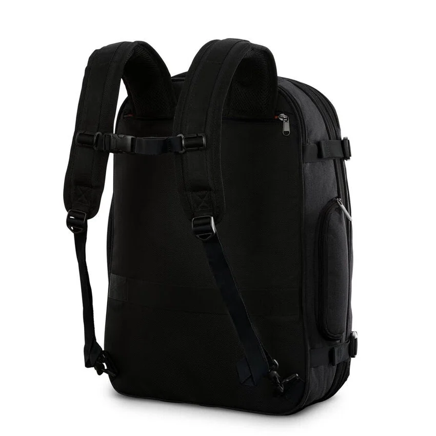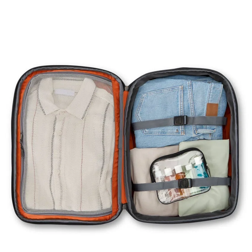 Esta mochila tiene un montón de bolsillos estratégicamente colocados por dentro y por fuera para que todo tenga su lugar. No solo es fácil de organizar, sino que es expandible con correas de compresión externas para que puedas meter tu mochila favorita en el compartimento superior del avión.