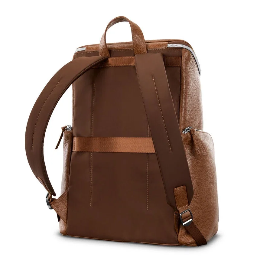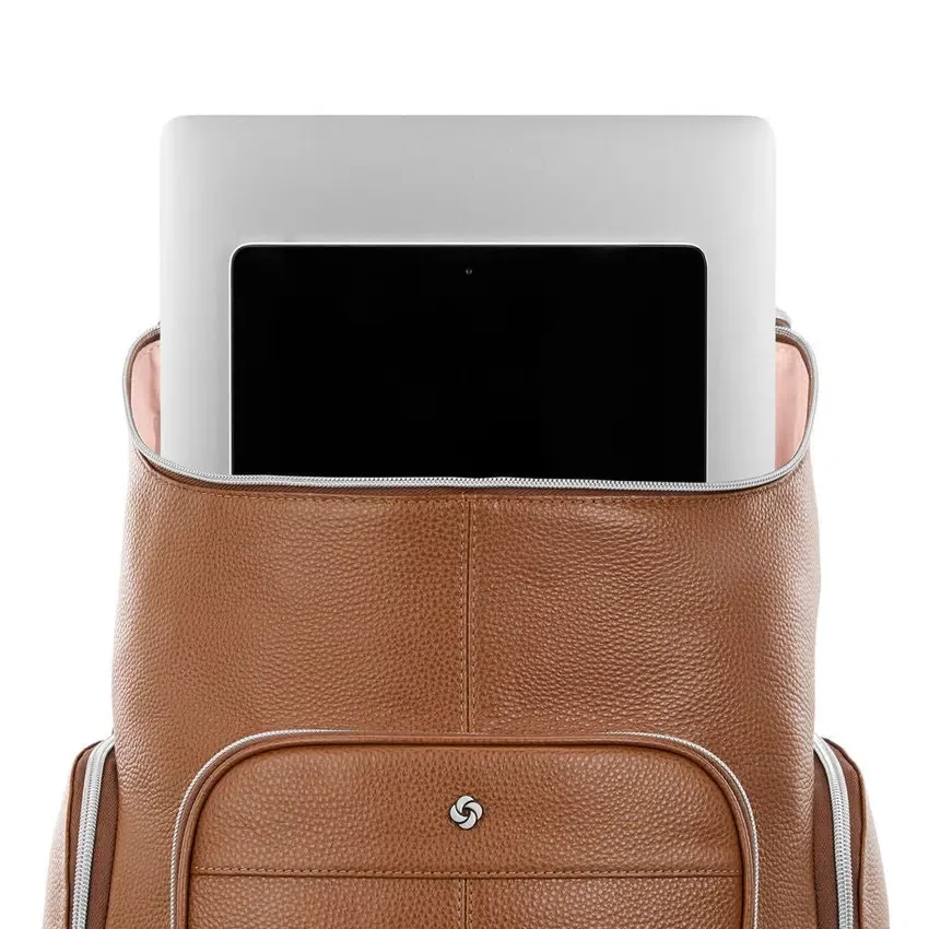 la mochila de piel de lujo cuenta con fundas acolchadas para laptop y tableta, un espacioso bolsillo frontal, dos bolsillos laterales con cremallera para tu botella de agua o paraguas, y cómodas correas para los hombros. la correa stackit™ incorporada facilita tus desplazamientos y viajes.