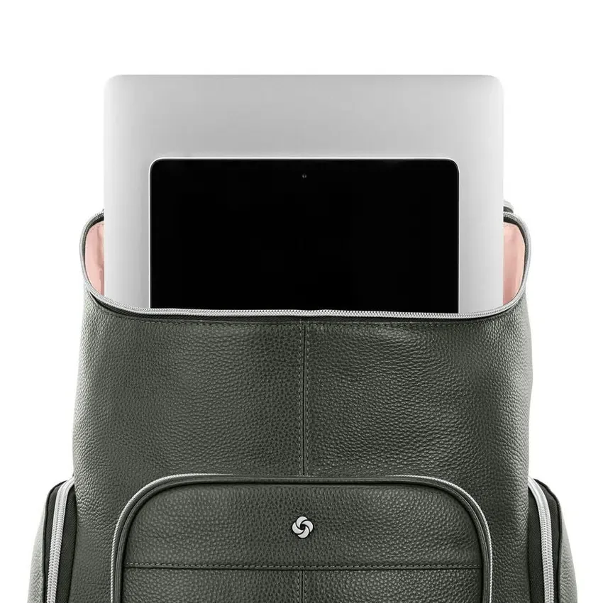 la mochila de piel de lujo cuenta con fundas acolchadas para computadora portátil y tableta, un espacioso bolsillo frontal, dos bolsillos laterales con cremallera para tu botella de agua o paraguas, y cómodas correas para los hombros. la correa stackit™ incorporada facilita tus desplazamientos y viajes.