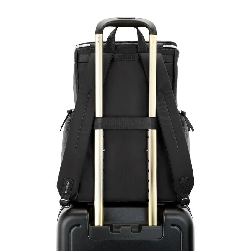 la mochila de piel de lujo cuenta con fundas acolchadas para laptop y tableta, un espacioso bolsillo frontal, dos bolsillos laterales con cremallera para su botella de agua o paraguas, y cómodas correas para los hombros. la correa stackit™ incorporada facilita sus desplazamientos y viajes.